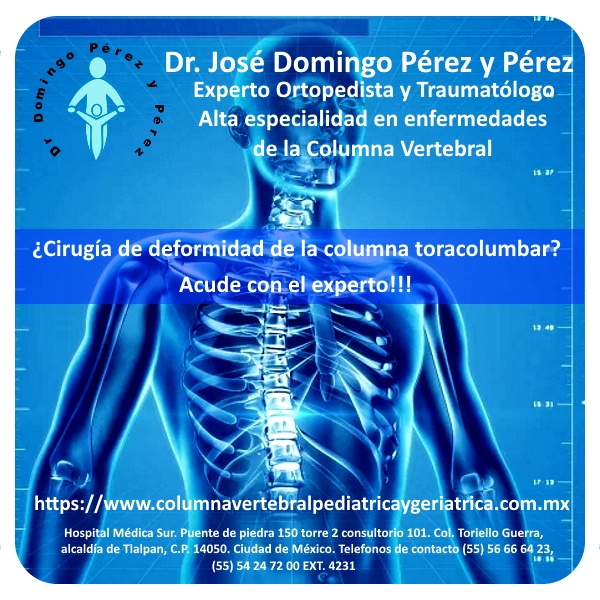 Dr. José Domingo Pérez y Pérez. Dedicado de tiempo completo a atender los problemas de la Columna Vertebral en Adultos y Niños, es decir Diagnóstico, Prevención y Tratamiento de las Enfermedades de la Columna Vertebral en Adultos y Niños. Ejerciendo este quehacer desde hace 25 años.Hospital Médica Sur. Puente de piedra 150 torre 2 consultorio 101. Col. Toriello Guerra. Alcaldia Tlalpan, C.P. 14050. Ciudad de México, México. Puente de Piedra 150, Toriello Guerra, Tlalpan, 14050 Ciudad de México, (55) 56 66 64 23 y (55) 54 24 72 00 EXT. 4231